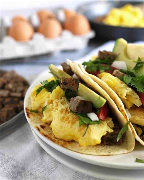 A quick breakfast option - sautéed steak slices wrapped in tortillas with scrambled eggs and cheese.